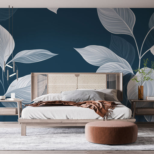 WonderMuralVår tealblåa fototapet framhäver ett raffinerat mönster av vita löv med delikata konturer. Kontrasten mellan det djupa blå och de subtila lövdesign...