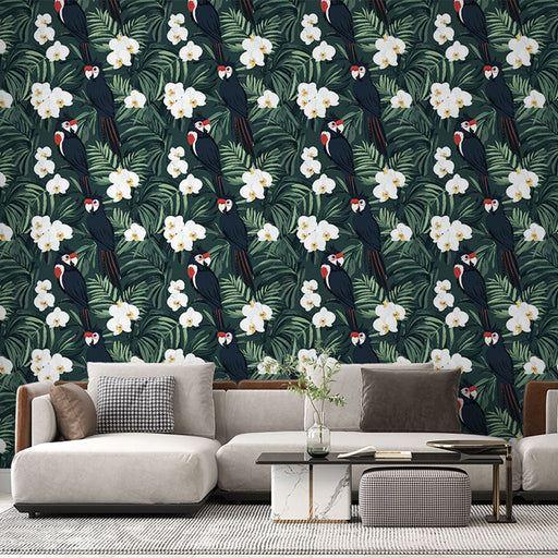 WonderMuralDenna tapet sticker ut med sitt fängslande tropiska mönster, med eleganta papegojor bland frodig lövverk och delikata blommor. Användningen av mörk...