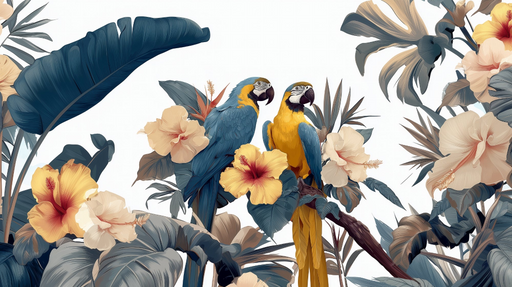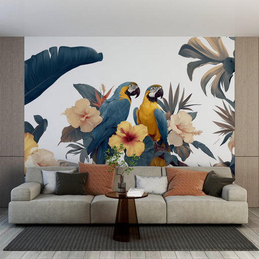 WonderMuralDenna tapet framhäver ett rikt och levande motiv av exotiska papegojor ackompanjerat av delikata blad på en ljus bakgrund. Nyanserna av blått och g...