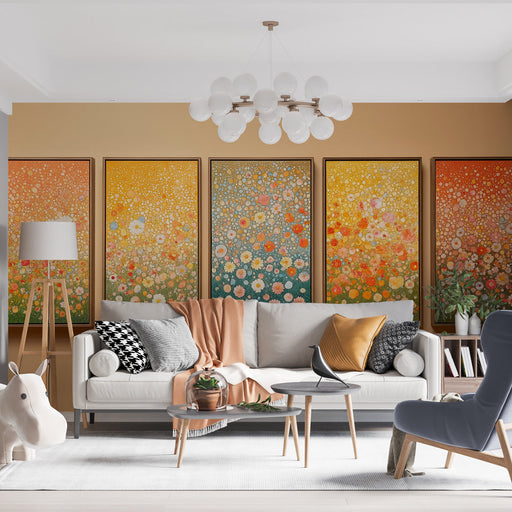 Dessa blomsterkompositioner inbjuder till dagdrömmar och en sensorisk resa. Varje blick avslöjar nya detaljer: ett delikat skuggat kronblad, en graciöst böjd stjälk, en blomknopp redo att slå ut. Denna poetiska visuella rikedom förvandlar dina väggar till levande målningar, där fantasin vandrar genom en evig trädgård av mjuka färger.