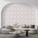 Denna geometriska tapet har ett mönster av vita löv som elegant upprepas på en mjuk rosa bakgrund. Perfekt för att lägga till en touch av modernitet och charm till vilket rum som helst, det är ett idealiskt val för vardagsrummet eller sovrummet.