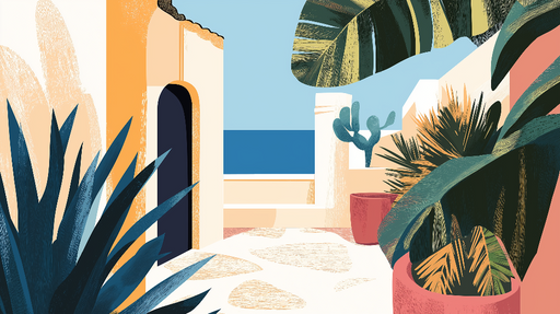 WonderMuralDenna tapet väcker en fridfull Medelhavslandskap, med livliga inslag av tropiska växter och en lugnande utsikt över havet. De mjuka nyanserna av or...
