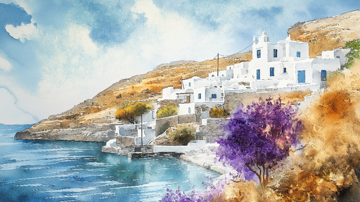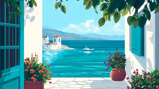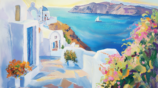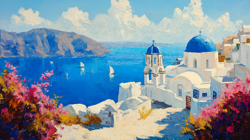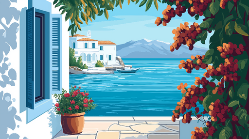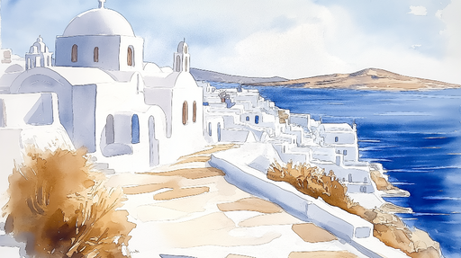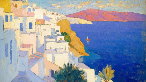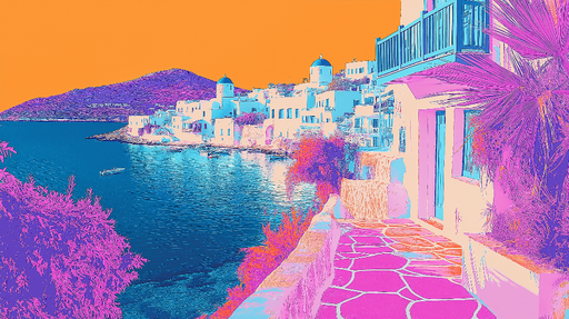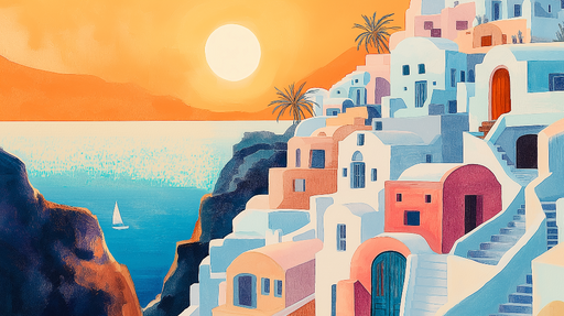 WonderMuralDyk ner i sommaratmosfären med vår Tapet som skildrar en stiliserad grekisk kustlandskap, där varje levande nyans leker med ljuset. De ikoniska vit...