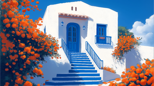 WonderMuralUpptäck vår tapet som visar ett charmigt vitt hus i medelhavsstil, smyckat med frodiga apelsinblommor. Denna livfulla design påminner om soliga öar...