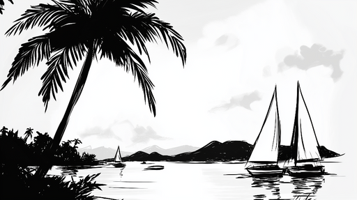 WonderMuralUpptäck vår tapet som illustrerar en lugnande havslandskap, skapat i en elegant svartvit teckning. Palmträds silhuetter och segelbåtar som flyter p...