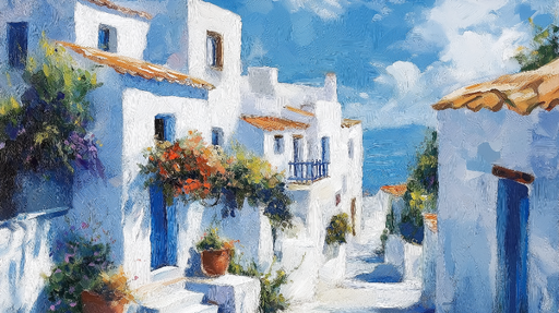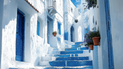 WonderMuralDenna tapet väcker en charmig Medelhavsgränd, där de ljusa vita väggarna matchar med livliga blå dörrar och fönster. Stoppet fyllt med blommande vä...