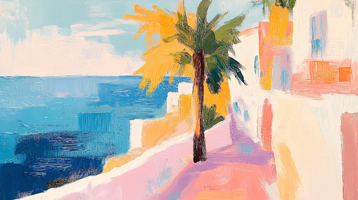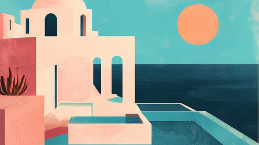 WonderMuralDenna tapetmålning avbildar en medelhavslandskap stiliserad med pastellfärgade byggnader och en strålande soluppgång mot en havsliknande bakgrund. ...