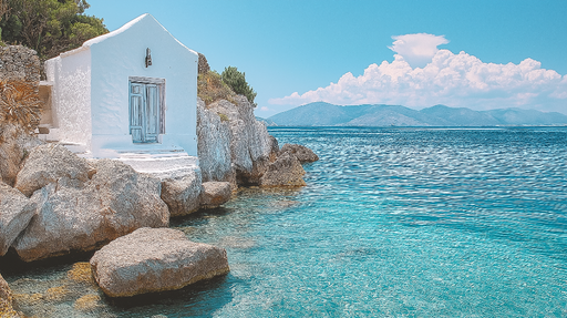WonderMuralDenna tapet framhäver ett charmigt vitt hus som är placerat på klippor vid ett kristallklart hav. Den lugnande scenen för tankarna till de pittores...