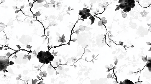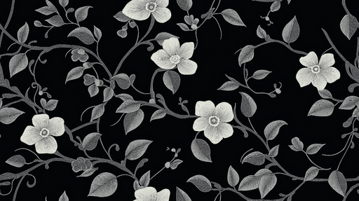 WonderMuralDenna shabby chic-tapetmålning har ett elegant mönster av vita och grå blommor på en djupt svart bakgrund, vilket skapar en slående kontrast som dr...