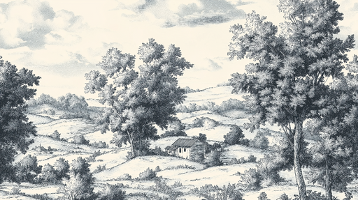 WonderMuralDenna shabby chic-tapet erbjuder en magnifik vy över en pastoral landskap, illustrerad i svartvita toner. Den delikata designen framhäver ett litet...