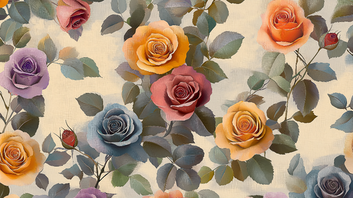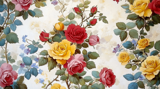 WonderMuralDenna shabby chic-tapetmålning visar ett praktfullt mönster av flerfärgade rosor, som sträcker sig från mjuk rosa till ljusgul, ackompanjerat av fr...