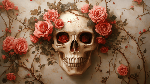 WonderMuralDenna djärva tapet fångar en estetik som är både mörk och romantisk, med en skalle omgiven av frodiga röda rosor, som framträder från en krämfärgad...