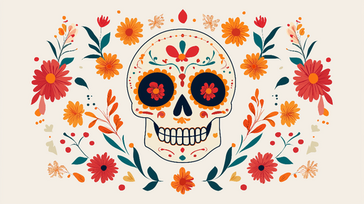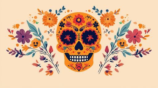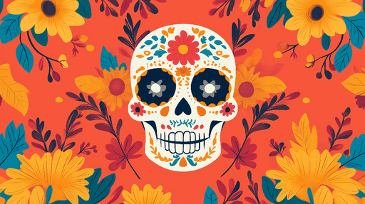WonderMuralDenna levande illustration av en sockerkranium omges av en explosion av ljusa orange blommor, vilket påminner om de traditionella firandena av de d...
