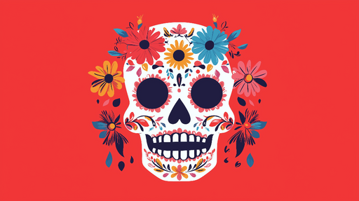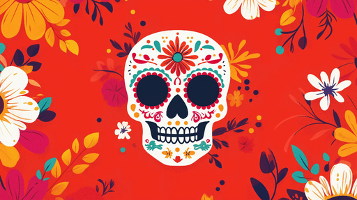 WonderMuralFestive Calavera Skull Denna dynamiska tapetmålning har en stor calavera-stilskalle, vackert dekorerad med färgglada blommönster på en ljus röd bak...