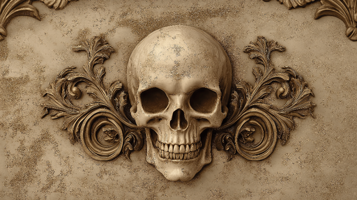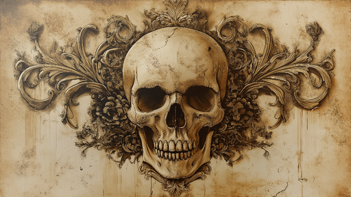 WonderMuralDyk ner i en barock och djärv värld med denna tapet som skildrar en majestätisk dödskalle, inramad av intrikata blomrankor. Den åldrade texturen oc...