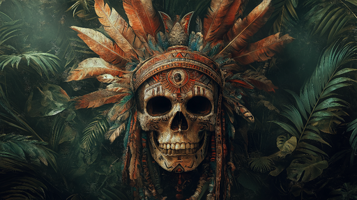 WonderMuralTribal Skull in Headdress Denna djärva illustration visar en skalle smyckad med en komplex huvudbonad, omgiven av frodig tropisk vegetation. Textur...