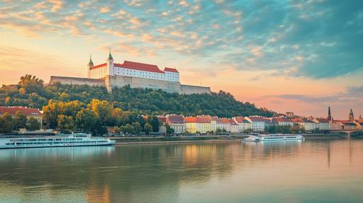 Art'loloFörvandla ditt utrymme med vår fototapet landskap som skildrar ett majestätiskt slott vid vattnet, badat i det mjuka ljuset från skymningen. Denna ...