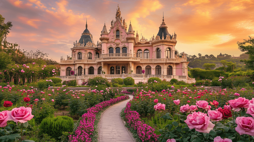 Art'loloDenna romantiska slottstapet erbjuder en förtrollande vy över ett praktfullt rosa slott omgivet av magnifika blomsterträdgårdar. Perfekt för att lä...