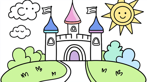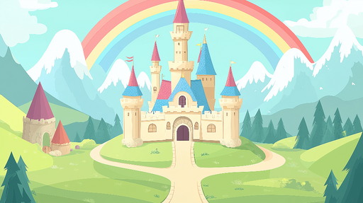 WonderMuralDenna tapetmålning illustrerar ett sagoslott i pastellfärger, omgivet av gröna kullar och leende moln. Tornen med blå och rosa tak lägger till en t...