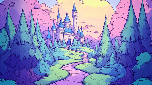 WonderMuralUpptäck vår tapet som illustrerar ett sagoslott omgivet av frodiga kullar och majestätiska skogar. Slottet, med sina pastellfärgade torn och skiffe...