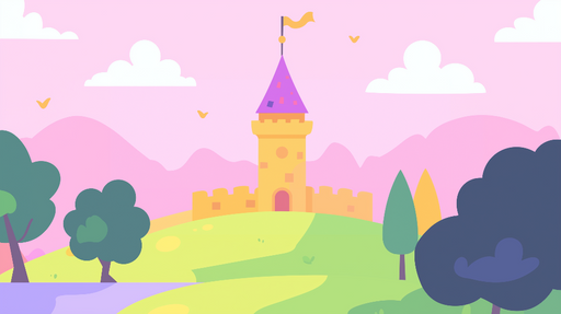 WonderMuralDenna tapet framhäver en borg i levande färger, belägen på en frodig kulle omgiven av stiliserad natur. Den rosa himlen i bakgrunden och de mjuka m...