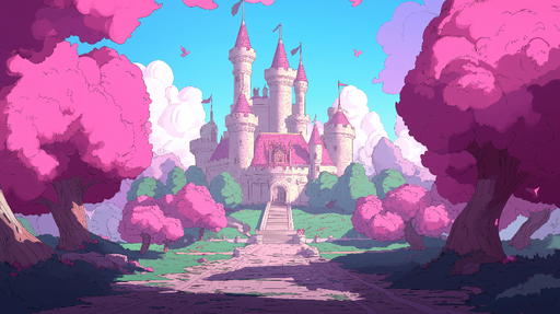WonderMuralDyk ner i en förtrollad värld med vår fairy castle mural wallpaper, som skildrar ett magnifikt slott omgivet av träd med ljusa rosa blommor. Denna ...