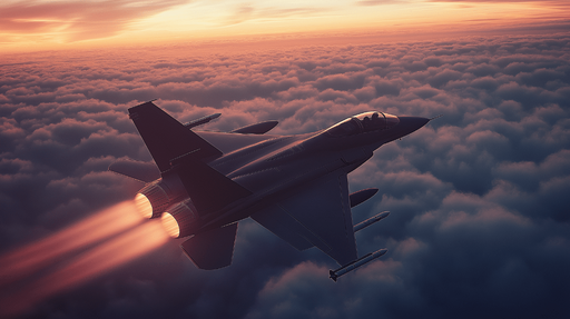 Visa fullständiga detaljerFototapet stridsflygplan i flykt | Flyger ovanför molnen vid solnedgången