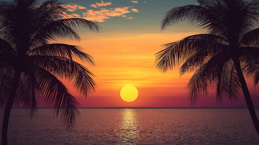 Visa fullständiga detaljerTapet solnedgång | Stiliserad tropisk scen med palmträd och vågor