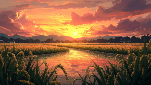 WonderMuralDenna tapetmålning inspirerad av naturliga landskap framhäver en magnifik solnedgång över frodiga risfält. Nyanserna av ljusgrönt hos risplantorna ...