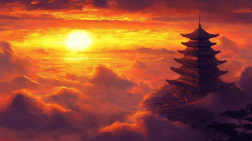 WonderMuralDyka in i den fängslande atmosfären av vår fototapet pagoda, där en majestätisk asiatisk byggnad stolt står ovanför molnen, badad i de vibrerande n...