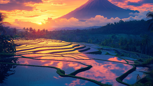 WonderMuralDenna tapet illustrerar en magnifik solnedgång över terrasserade risfält, där varma och levande färger blandas för att skapa en lugnande och inspir...