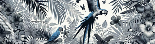 VisualsDenna eleganta papegojtapet är en hyllning till naturens ömhet och grace, där blåa papegojor och en myriad av fjärilar vecklar ut sig på en monokro...