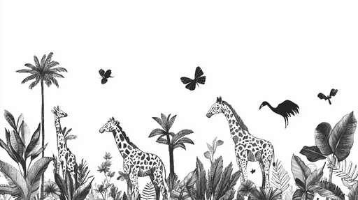 Art'loloOmvandla ditt utrymme med vår eleganta tapet med djungelmotiv, med gracila giraffer, frodiga palmträd och delikata fjärilar, allt i sofistikerad sv...