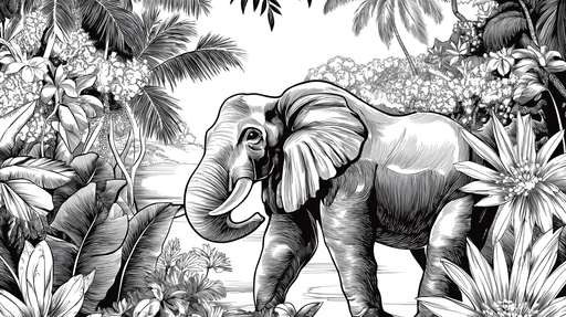 Visa fullständiga detaljerTapet elefant | Elegant elefant i en frodig svartvit djungel