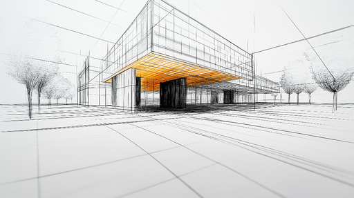 Visa fullständiga detaljerTapet modern arkitektur | Skiss av en samtida byggnad med orange inslag