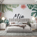 Denna charmiga fototapet har namnet Mia i centrum, omgivet av ett magnifikt mönster av tropiska blad och rosa blommor. De delikata detaljerna och de livfulla färgerna ger en touch av friskhet och exotism till vilket rum som helst.