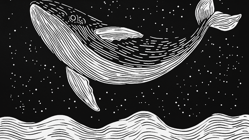 WonderMuralUpptäck vår unika fototapet med en majestätisk val som hoppar genom stiliserade vågor, allt mot en djup svart bakgrund beströdd med skimrande stjär...