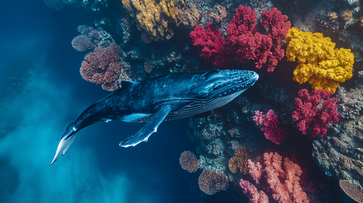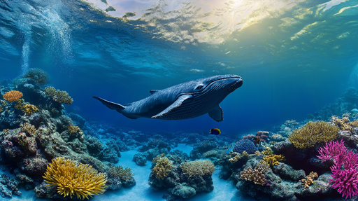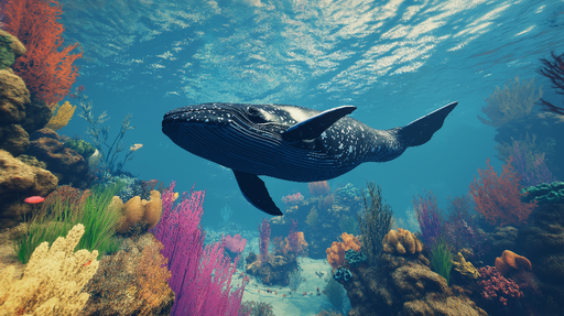 Visa fullständiga detaljerFototapet underwater-whale | En majestätisk val simmar bland färgglada koraller