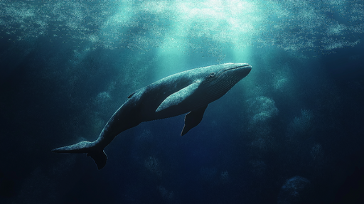WonderMuralVår fototapet illustrerar en majestätisk val som rör sig genom havets vidsträckta djup, omgiven av ljusstrålar som filtrerar genom vattnet. Nyanser...