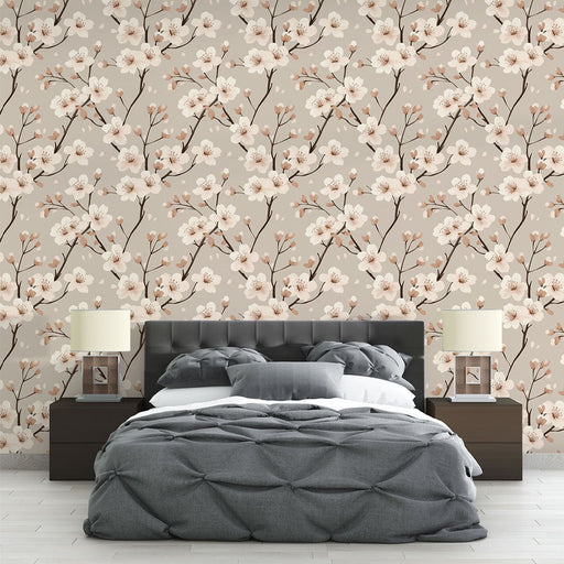 WonderMuralVår fototapet har ett subtilt mönster av delikata blommor på en mjuk beige bakgrund, vilket skildrar vita och bruna blommor som sammanflätar harmon...