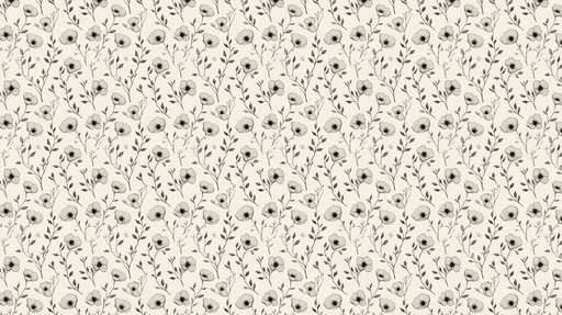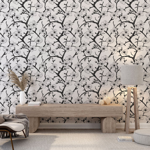 WonderMuralVår tapet har ett delikat mönster av svarta och vita blommor noggrant illustrerade mot en mjuk krämig bakgrund, vilket skapar en harmonisk kontrast...