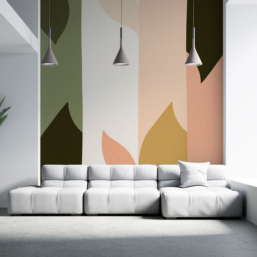 WonderMuralDenna fototapet har en modern design som blandar stiliserade löv och geometriska former i en mjuk färgpalett. Nyanserna av djupt grönt och varmt br...