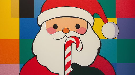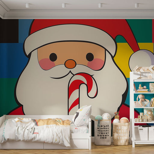 WonderMuralDenna tapetmålning har en glad och stiliserad Jultomte som håller en polkagris mot en bakgrund av levande och moderna färgblock. De ljusa färgerna ...