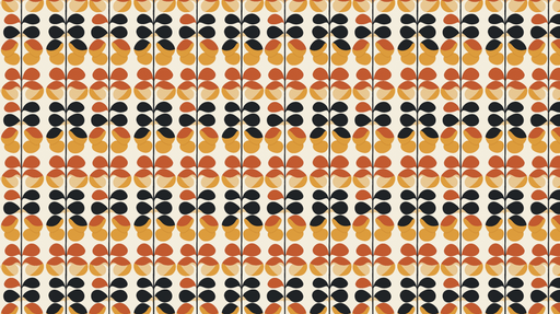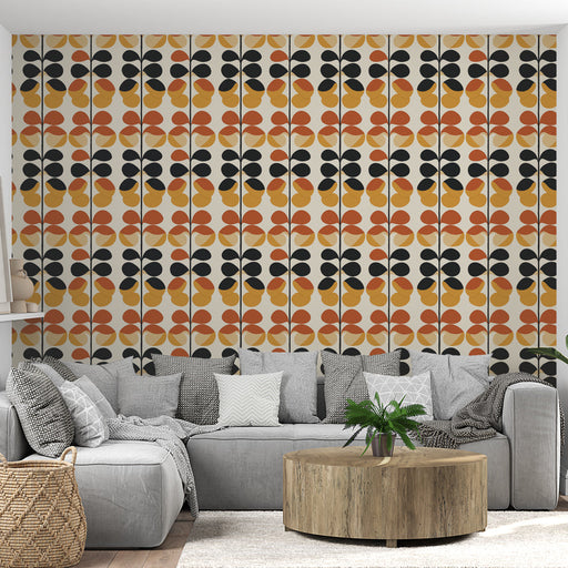 WonderMuralVår exklusiva fototapet visar ett livligt geometriskt blommigt mönster, som kombinerar varma nyanser av orange, gul och svart på en ljus bakgrund. ...