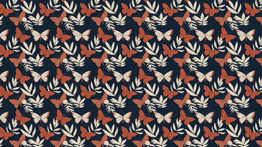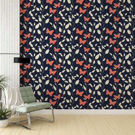 WonderMuralVår förtrollande Fototapet har ett fantastiskt mönster av röda fjärilar som blandar sig med krämfärgade löv på en marineblå bakgrund, vilket skapar...