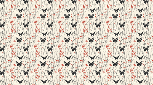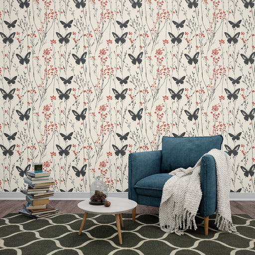 WonderMuralVår exklusiva Fototapet har ett elegant mönster av svarta fjärilar som flyger bland delikata röda blommor och tunna stjälkar. Designad på en krämig...