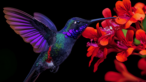 WonderMuralFira naturen med vår tapet med en livlig kolibri, delikat svävande ovanför ljusröda blommor. Kolibrins lila, gröna och blå nyanser blandas med de e...