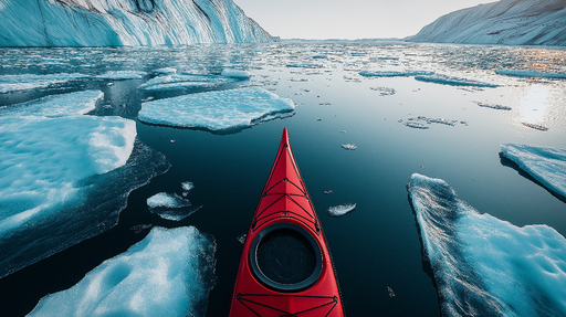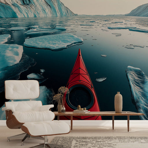 WonderMuralDenna fängslande fototapet har en röd kajak som navigerar i isiga vatten, omgiven av majestätiska isberg. Nyanserna av blått i vattnet och den leva...