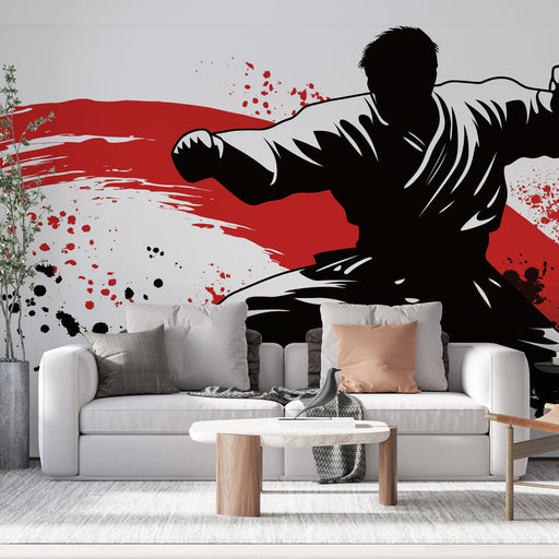 WonderMuralDenna dynamiska tapet fångar intensiteten och rörelsen hos en kampsportare i en slående kontrast av svart och rött. Illustrationen använder djärva ...