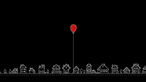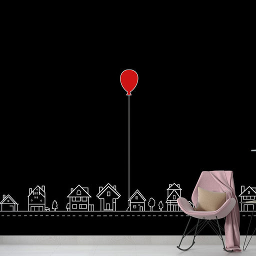 Visa fullständiga detaljerFototapet hus och röd ballong | Hus i vit kontur med en flytande röd ballong